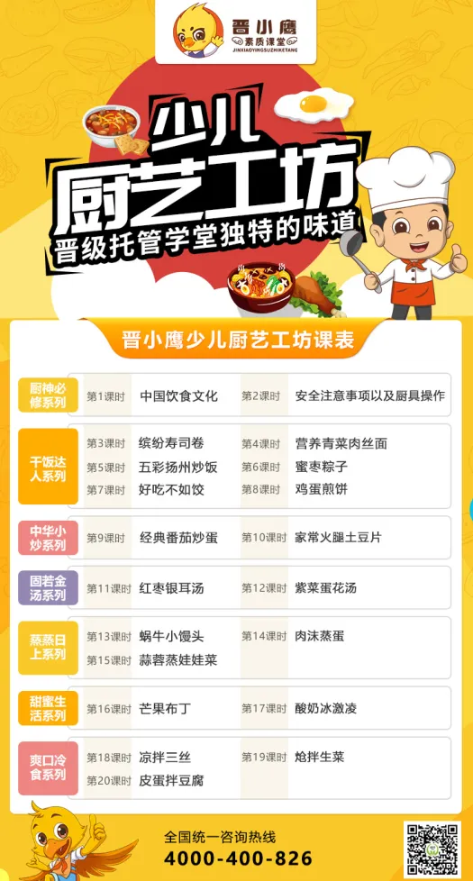 晋小鹰少儿厨艺工坊,为学生的成长赋能,解决双减下家长的教育焦虑,为校区打造独有的特色项目。