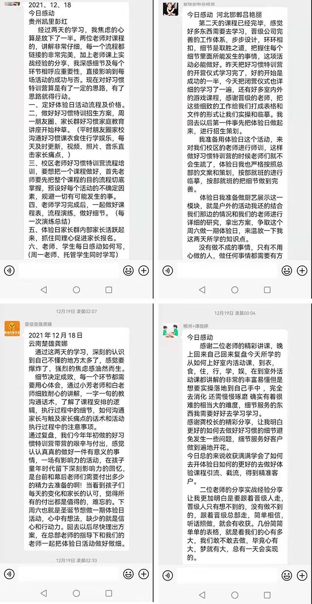 本次内训会的学习对学员们而言,打开了关于晋级研学体系的大门,总部毫无保留地向校区进行知识和经验的传输,也是希望通过内训活动,增强校区的服务质量和口碑,增强校区营利能力和拓展能力。老师们也对学员们寄予期望,希望他们积极运用所学,应用到校区实践中,不断进步实现校区的发展和突破。