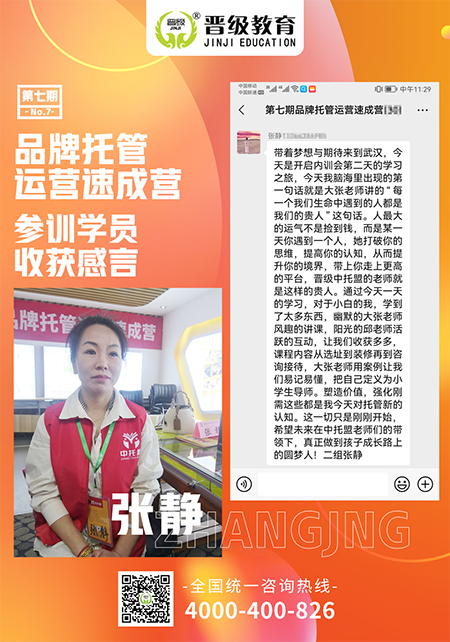“19年我爱人参加了晋级大会,他非常认可晋级的理念,觉得跟晋级非常的同频,但当时晋级的加盟费太贵了负担不起,只好跟着晋级学习先一点点学习,开始慢慢尝试搭建校区。直到去年晋级总部的老师到安徽阜阳开会,李校长主动邀请了总部的老师去我的校区开会,当听到中托盟这个品牌时,我毅然决然刷卡加盟。但是正值年前,我也是顶着巨大的压力,新开了一家占地1500平方的校区,经过了这么久的经营,现在的学生已经达到240多人了,我们用高品质的服务来吸引家长、吸引孩子,我觉得自己越做越有信心。这次过来学习的目的就是要在小区把研学活动做起来,相信有了前期的付出,家长们也一定会大力支持!”