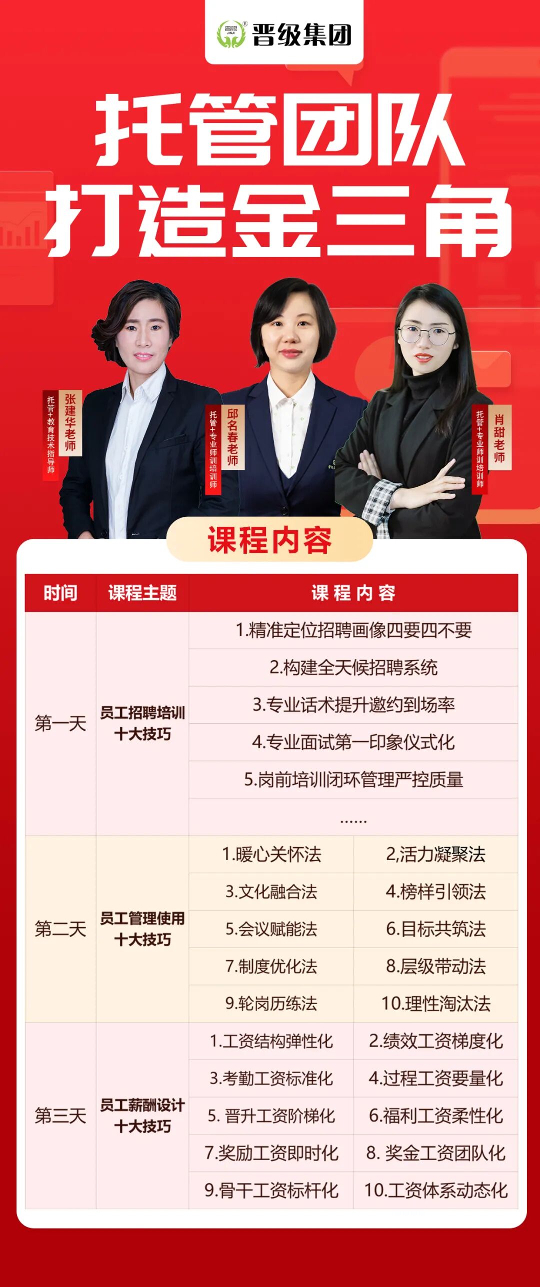 晋级集团21年托管经验,倾力打造 《托管团队打造金三角》线上系列直播课,3天直播,30大技巧,从招聘到管理再到薪酬设计,一站帮你理清思路,学完就能落地!