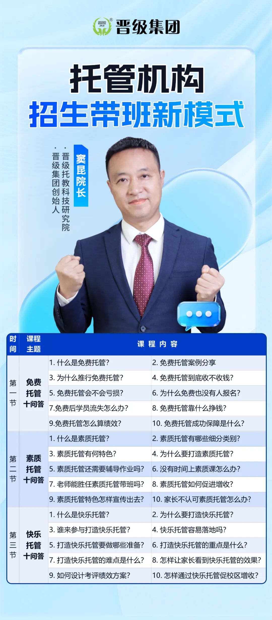 除《托管机构招生带班新模式》外,晋级线上课程体系 “晋管学”更有全年500+场专业课程,涵盖托管运营、人力资源、快乐托管、素质教育、招生转化等多个板块,每场2小时左右,价值超过50000元。