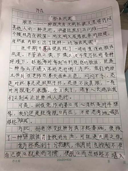 班里的这个现象被班主任孙老师发现了,他要求全班同学反思,陈浩就写了这篇作文。他诚恳地写到:“脏话很容易学,要改掉很难。我提醒自己,要说脏话时,憋着。”